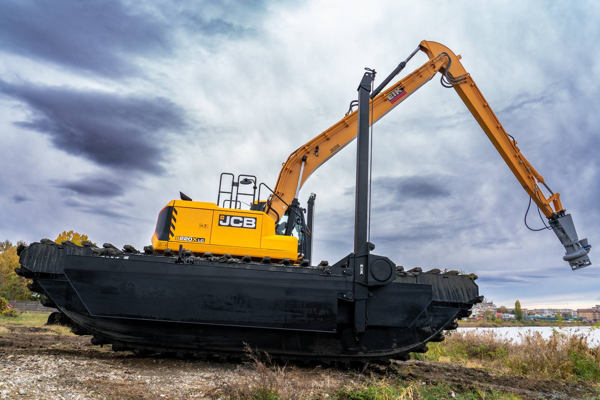 Excavator JCB 220X echipat cu pontoane șenilate amfibii, flotoare suplimentare cu piloni de fixare/ancorare, braț lung și pompă submersibilă cu rezistență mare la uzură cu acționare hidraulică / cupa de excavare / cupa de taluzare.